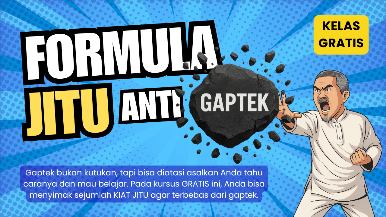 Gaptek bukan kutukan, tapi bisa diatasi asalkan Anda tahu caranya dan mau belajar. Pada kursus GRATIS ini, Anda bisa menyimak sejumlah KIAT JITU agar terbebas dari gaptek.